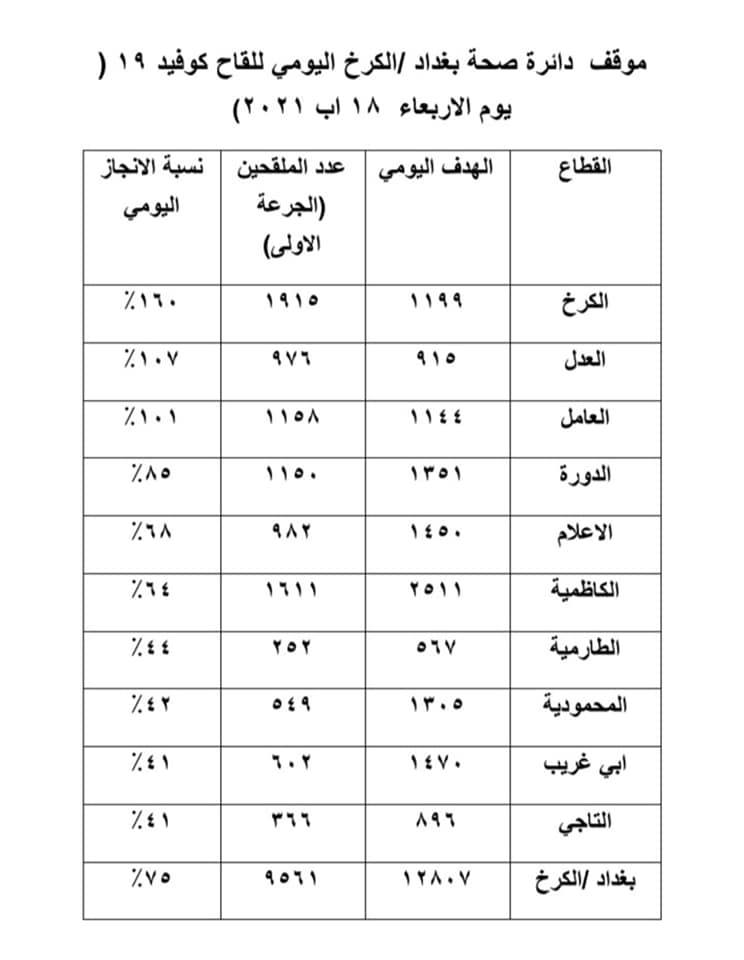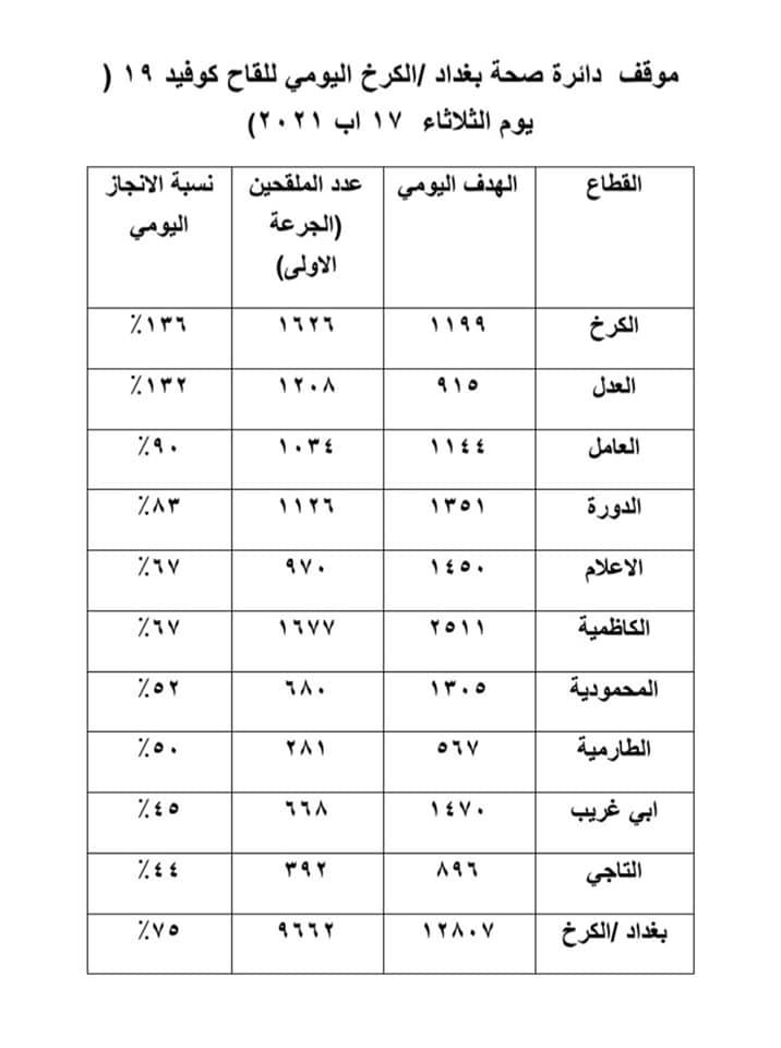 واشار الى، انه”بالنسبة لجانب الكرخ من بغداد تظهر الجداول المرفقة المناطق التي ستصل لنسبة كبيرة من الملقحين و المناطق التي ستبقى تحت رحمة الفيروس و سيفقد سكانها المزيد من احبائهم، و لاشك انهم سوف يؤثرون بشكل سلبي على سكان المناطق الاخرى التي ستكون اكثر اماناً، هذه دعوة لكل العقلاء من تلك المناطق التي تتسم بكثرة الاصابات و الوفيات و انخفاض نسبة التلقيح ان يتعاونوا معنا للاسراع بخلاص اهلهم من هذا الخطر المحدق، و انا على يقين ان كثير من المصابين فيها لم يسجلوا لعدم مراجعتهم و كثير منهم توفوا في البيوت و لم يسجلوا كمتوفين بالفيروس”.