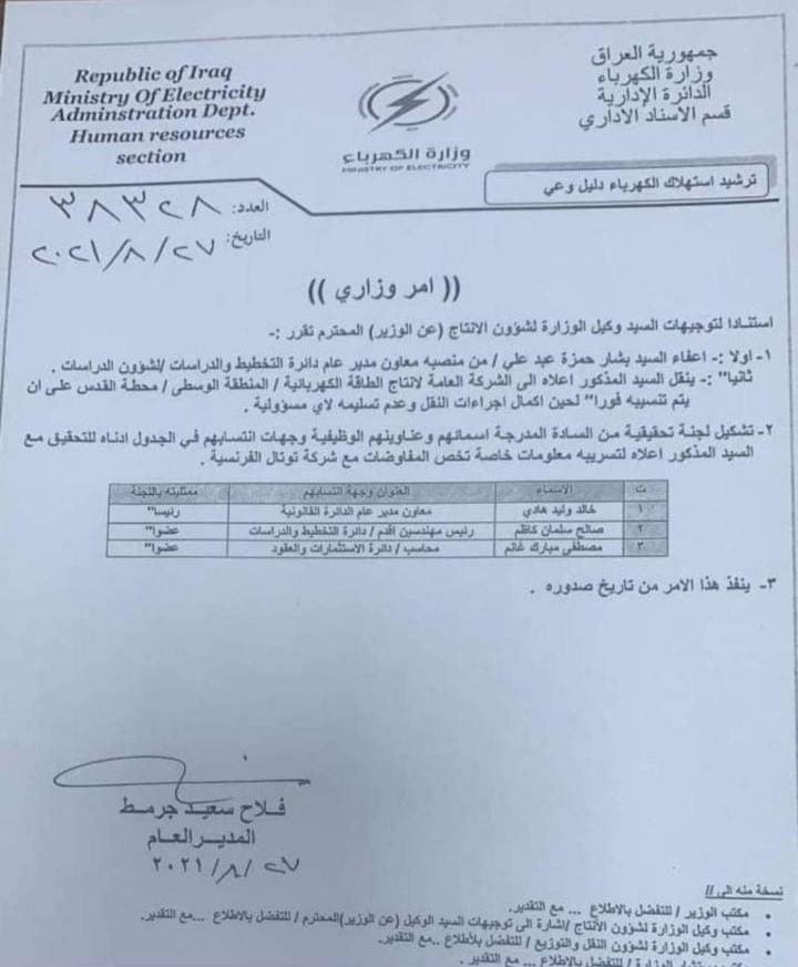 وجاء في أمر وزاري حصلت عليه “احداث الوطن”، أنه “تقرر إعفاء معاون مدير عام دائرة التخطيط بشار حمزة عبد علي من منصبه ونقله إلى الشركة العامة لإنتاج الطاقة الكهربائية/ المنطقة الوسطى، محطة القدس”.