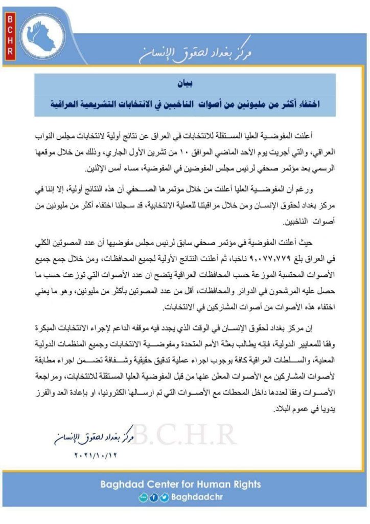 الرئيسية/اخبـار العراق/مركز بغداد لحقوق الانسان: اختفاء اكثر من مليونين من اصوات الناخبين في الانتخابات العراقية اخبـار العراق أخر الأخبار مركز بغداد لحقوق الانسان: اختفاء اكثر من مليونين من اصوات الناخبين في الانتخابات العراقية 2021-10-12 1٬291 2021-10-12 1٬291 شاركها فيسبوك X لينكدإن Tumblr بينتيريست Reddit VKontakte Odnoklassniki Pocket مشاركة عبر البريد طباعة