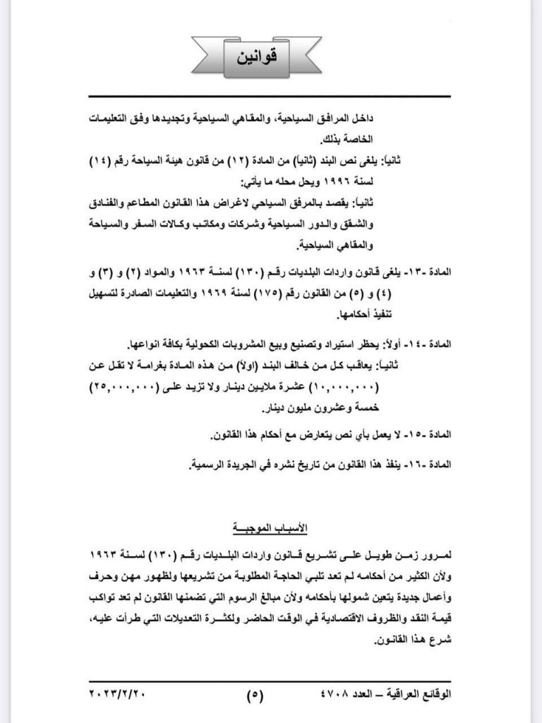 وجاء في العدد الاخير للجريدة الرسمية ، نص المادة (14) من قانون واردات البلديات، الذي يحظر استيراد وتصنيع وبيع المشروبات الكحولية، وفرض غرامات مالية على المخالفين.