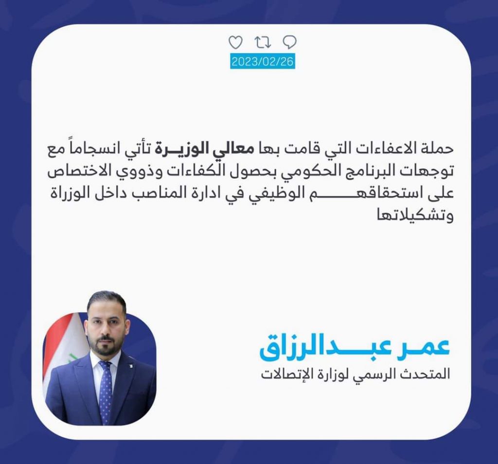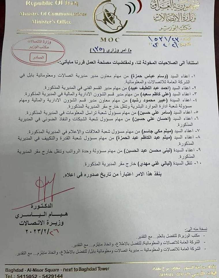 بالوثيقة.. إعفاءات بالجملة تطال مسؤولين بوزارة الاتصالات ومتحدثها يكشف الاسباب