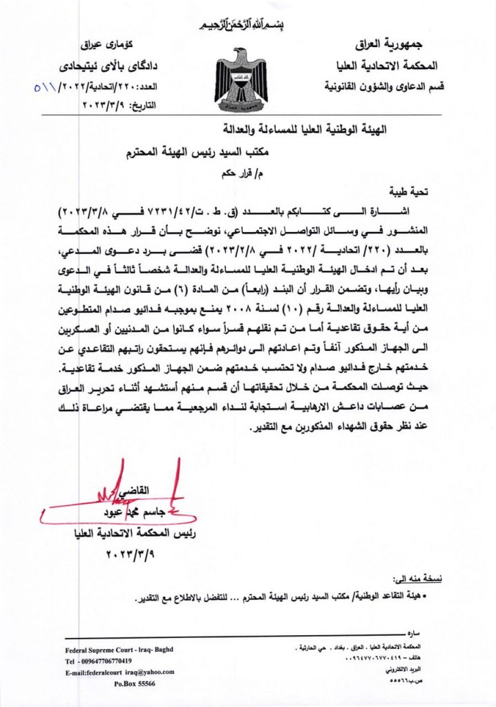الرئيسية/اخبـار العراق/المحكمة الاتحادية تصدر توضيحاً حول شمول فدائيي صدام بالرواتب التقاعدية اخبـار العراق المحكمة الاتحادية تصدر توضيحاً حول شمول فدائيي صدام بالرواتب التقاعدية 2023-03-09 5٬630 2023-03-09 5٬630 شاركها فيسبوك X لينكدإن Tumblr بينتيريست Reddit VKontakte Odnoklassniki Pocket مشاركة عبر البريد طباعة