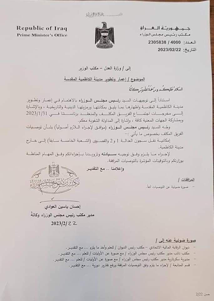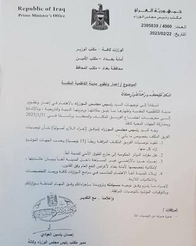اصدر مكتب رئيس الوزراء محمد شياع السوداني توجيهات تخص تطوير مدينة الكاظمية.