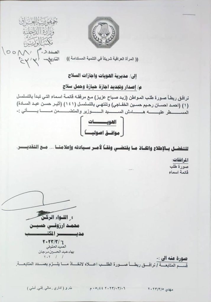 زيد الطالقاني يحصل على موافقة تخصيص اسلحة لـ 141 شخصا من قبل وزارة الداخلية