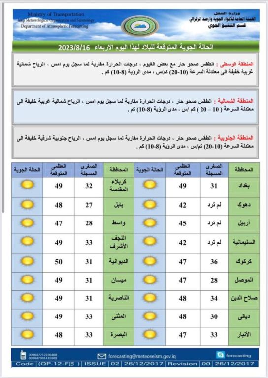 توقعت هيئة الأنواء الجوية، أن تسجل درجات الحرارة أعلى معدل لها 49 درجة مئوية ليوم غد الخميس.