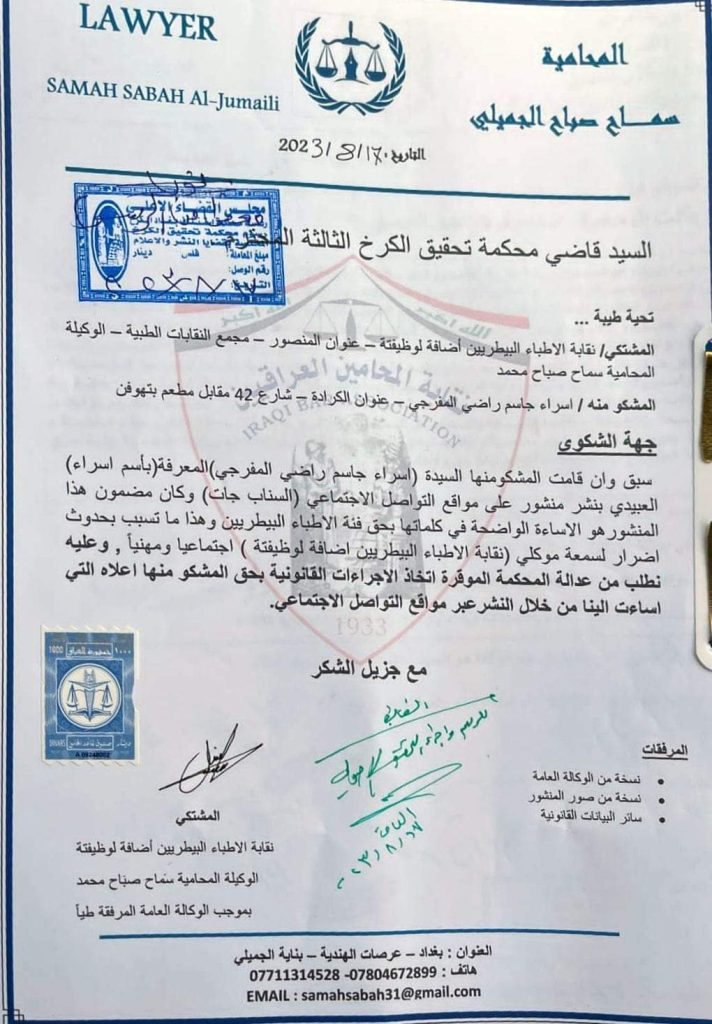 نقابة البيطريين تستهجن تجاوز “اسراء العبيدي” وتقييم دعوة قضائية ضدها