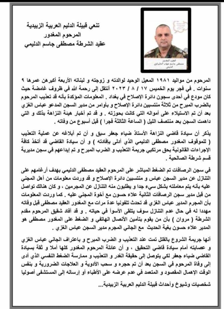 فيما اصدرت قبيلة الدليم التي ينتسب اليها الضحية بيانا تلقت “وطن نيوز” نسخة منه استنكرت العمل الاجرامي الذي لحق بأبنهم ، مطالبين القضاء العراقي بانزال اقسى العقوبات بحق منفذي الجريمة وعلى رأسهم عباس الغزي مدير السجن.