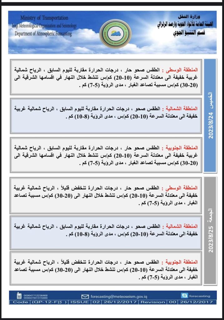 وقالت الهيئة في بيان تلقت “وطن نيوز” نسخة منه ان الاجواء العراقية للمنطقتين الوسطى والجنوبية ستشهد ارتفاعا طفيفا للحرارة ، فيما ستنخفض نهاية الاسبوع الجاري مع تصاعد الغبار.انتهى.م.م