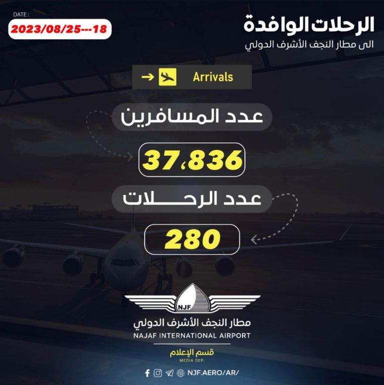 مطار النجف يعلن أعداد الزائرين الوافدين للعراق خلال اسبوع واحد