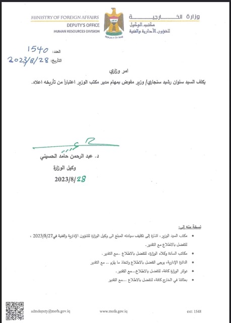 تكليف سنجاري بمهام مدير مكتب وزير الخارجية ونقل السابق الى احدى الدول