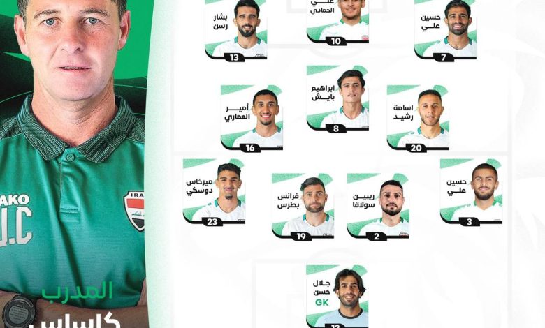 وذكر إتحاد الكرة في بيان تلقته “وطن نيوز ” أن” المدرب كاساس اختار كل من: جلال حسن لحراسة المرمى واللاعبين ريبين سولاقا وفرانس بطرس وميركاس دوسكي وحسين علي واسامة رشيد وإبراهيم بايش وامير العماري وحسين علي وعلي الحمادي وبشار رسن، فيما ضمت قائمة البدلاء كل من: الحارس فهد طالب واللاعبين أحمد باسل وماسيس أرتين وأحمد يحيى وعلي عدنان وباشانغ عبد الله وزيدان اقبال وأمجد عطوان وأندريه السناطي وأحمد فرحان وأيمن حسين وأمين الحموي”.