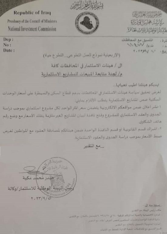 أصدرت الهيئة الوطنية للاستثمار، تعليمات جديدة للسيطرة على أسعار الوحدات السكنية.