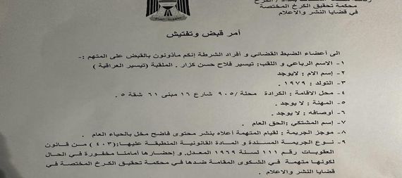وجاء امر القبض بعد ان تم صدور امر الاستقدام على المدعوة تيسير العراقية وعدم حضورها الى القضاء./انتهى8