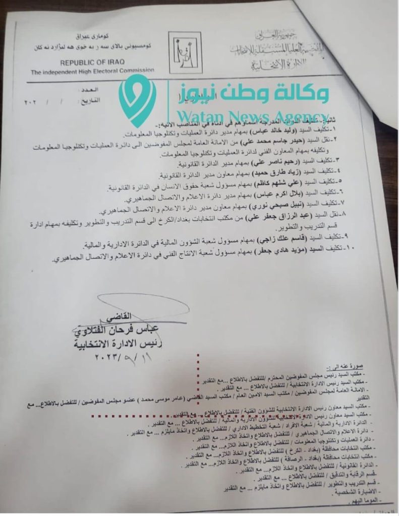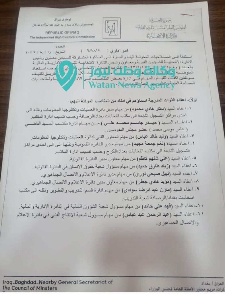 حصلت وكالة “وطن نيوز” اليوم الثلاثاء، على اسماء المدراء الجدد الذين تم تعيينهم ضمن المفوضية العليا للانتخابات.