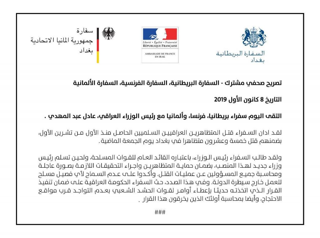 طالبت ثلاث دول كبرى في بيان مشترك اليوم الأحد، الحكومة العراقية بعدم السماح لأي فصيل مسلح بالعمل خارج سلطة الدولة.