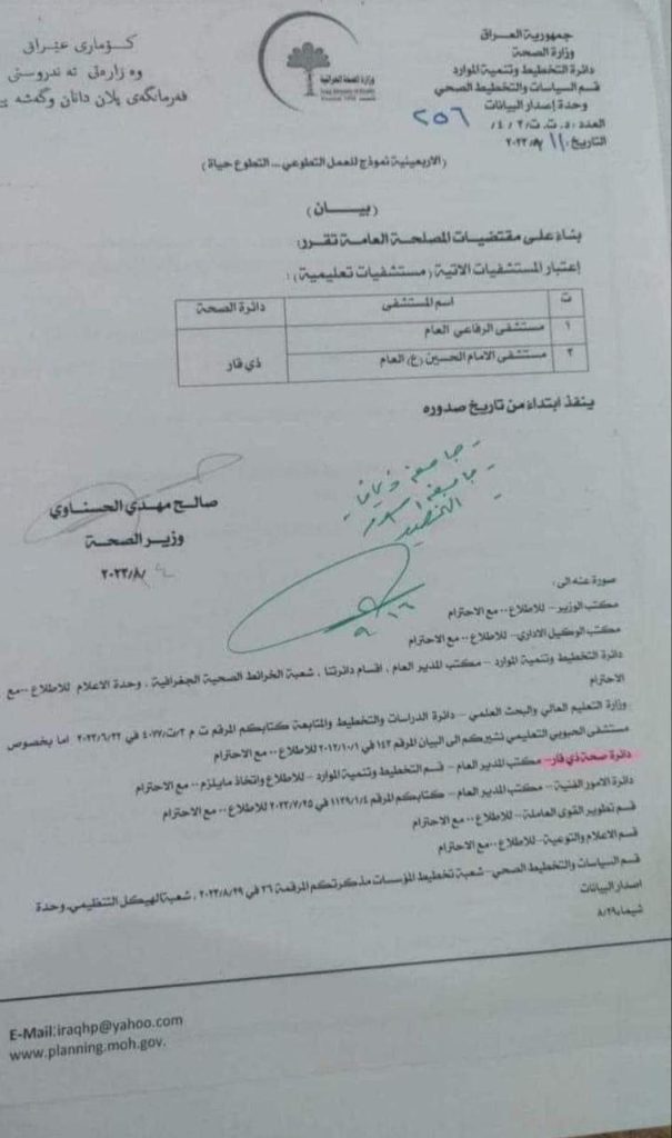 بالوثيقة.. الحسناوي يوافق على تحويل مستشفى الرفاعي العام الى مستشفى تعليمي