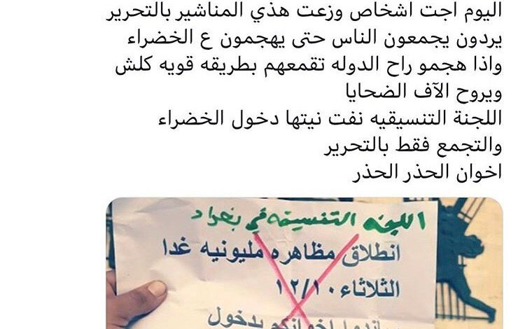 أفاد مراسلنا في ساحة التحرير وسط العاصمة بغداد بوجود منشورات يتم تداولها في الساحة تحرض المتظاهرين على دخول المنطقة الخضراء.