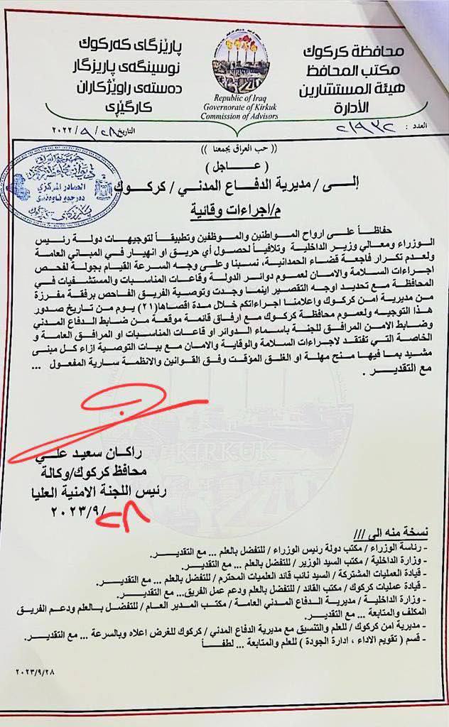 وجه محافظ كركوك وكالة اليوم الخميس، بفحص إجراءات السلامة في دوائر الدولة وقاعات المناسبات والمستشفيات لعدم تكرار فاجعة قضاء الحمدانية.