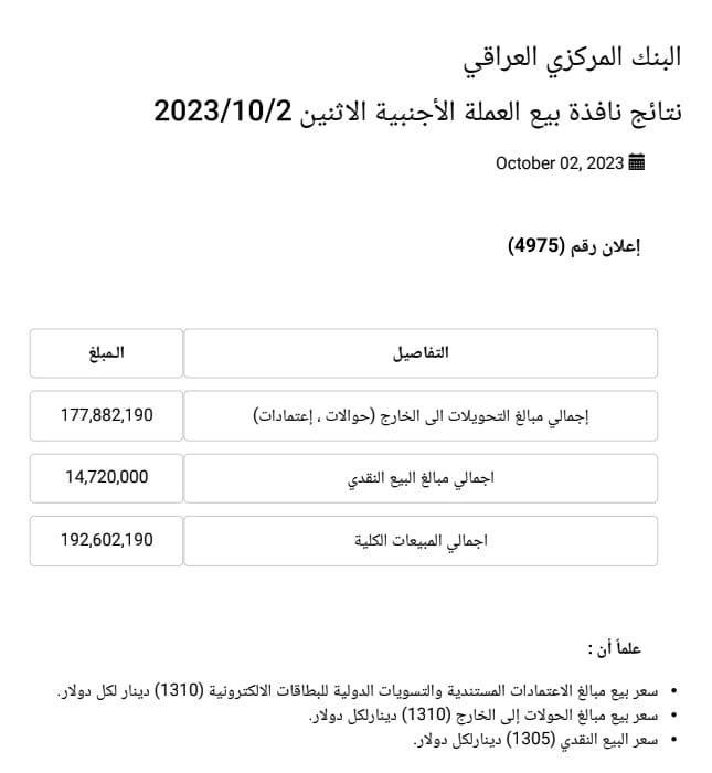 اعلن البنك المركزي، عن بيعه اكثر من 192 مليون دولار بمزاد اليوم الاثنين.