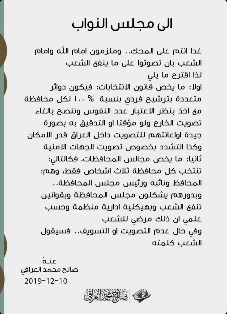 خاطب صالح العراقي المعروف بقربه من زعيم التيار الصدري مقتدى الصدر اليوم الثلاثاء، مجلس النواب العراقي قائلا “غدا انتم على المحك”.