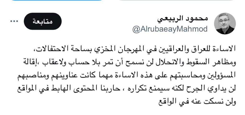 الرئيسية/اخبـار العراق/الربيعي: مظاهر “السقوط والانحلال” في المهرجان المخزي لن تمر دون عقاب اخبـار العراق الربيعي: مظاهر “السقوط والانحلال” في المهرجان المخزي لن تمر دون عقاب 2023-10-04 132 2023-10-04 132 شاركها فيسبوك X لينكدإن Tumblr بينتيريست Reddit VKontakte Odnoklassniki Pocket مشاركة عبر البريد طباعة