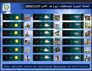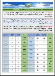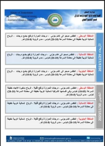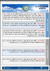 أعلنت الهيئة العامة للأنواء الجوية والرصد الزلزالي، اليوم الأحد، حالة الطقس في العراق للأيام الأربعة المقبلة، فيما توقعت أمطاراً متفرقة وعواصف رعدية يوم غد الإثنين.