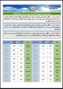 أعلنت هيئة الانواء الجوية، اليوم الأربعاء ، حالة الطقس المتوقعة في البلاد، فيما اشارت الى انخفاض بدرجات الحرارة وهطول امطار تكون في بعض الأحيان رعدية.