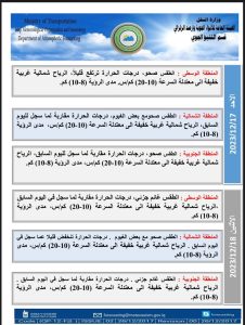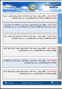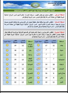أعلنت هيئة الأنواء الجوية، اليوم الخميس ، عن حالة الطقس في البلاد للأيام المقبلة، فيما توقعت تساقط أمطار خفيفة وارتفاع بدرجات الحرارة.