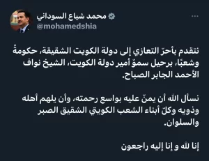 وقال السوداني، عبر منصة “إكس”: “نتقدم بأحرّ التعازي إلى دولة الكويت الشقيقة، حكومةً وشعبًا، برحيل سموّ أمير دولة الكويت، الشيخ نواف الأحمد الجابر الصباح”.