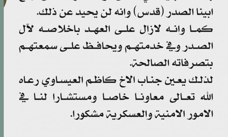 وقال صالح محمد العراقي، المقرب من زعيم التيار الصدري، في صفحته على موقع التواصل الاجتماعي “فيس بوك”، نقلاً عن الصدر، واطلعت عليها “أحداث الوطن” إنه “بعد ان تبين لي الحق.. وانه لازال على نهج ابينا الصدر (قدس) وانه لن يحيد عن ذلك، كما وانه لازال على العهد باخلاصه لآل الصدر وفي خدمتهم ويحافظ على سمعتهم بتصرفاته الصالحة، لذلك يعين جناب الاخ كاظم العيساوي رعاه الله تعالى معاونا خاصا ومستشارا لنا في الامور الامنية والعسكرية”.