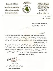 وبحسب وثيقة صادرة من مكتب النائب وحصلت عليها “وطن نيوز”، فأنه “نقدم الشكر لمجلس الوزراء للموافقة السابقة على صرف مبلغ (2.1) ترليون دينار على ثلاث دفعات كقروض الحكومة إقليم كردستان العراق وتخصيصها فقط لرواتب الموظفين، وكذلك خطواتكم الجادة لحل مشكلة رواتب موظفي الإقليم بشكل جذري من خلال تعديل قانون موازنة عام (2023)”.