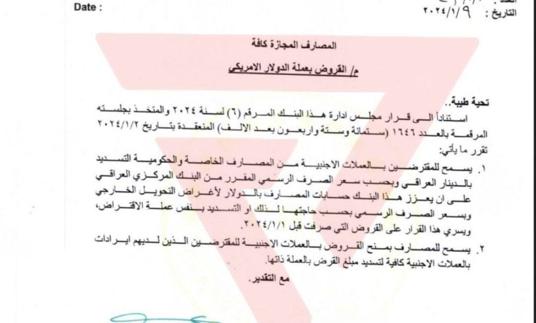 وأكد المركزي العراقي في بيان تلقت “وطن نيوز” نسخة منه انه يسمح للمقترضين بالعملات الاجنبية من المصارف الخاصة والحكومية التسديد بالدينار العراقي وبحسب سعر الصرف الرسمي المقرر من البنك المركزي العراقي ابتداء من 1/1/2024.