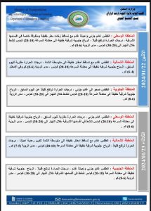 أعلنت هيئة الانواء الجوية، اليوم الأحد ، حالة الطقس المتوقعة في البلاد خلال الأيام المقبلة، مشيرة إلى تفاوت بدرجات الحرارة بين الارتفاع والانخفاض وفرص لتساقط الأمطار بدءًا من يوم غد. ادناه جدول توضيحي بحالة الطقس: