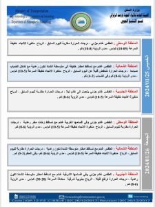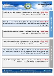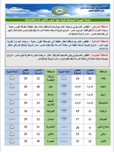 أعلنت هيئة الأنواء الجوية، اليوم الأثنين ،عن حالة الطقس في البلاد، فيما توقعت تساقطاً للأمطار خلال الأيام المقبلة .