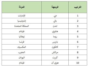 وشملت أفضل 10 وجهات للسفر مدينتين عربيتين وهما دبي الإماراتية ومراكش المغربية، التي جاءت في المرتبة الثامنة.
