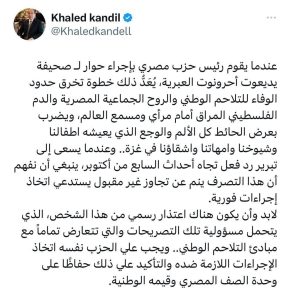 وأكد نائب رئيس حزب الوفد في منشور عبر صفحته الرسمية فيسبوك: أنه عندما يقوم رئيس حزب مصري بإجراء حوار لـ صحيفة يديعوت أحرونوت العبرية، يُعَدُّ ذلك خطوة تخرق حدود الوفاء للتلاحم الوطني والروح الجماعية المصرية والدم الفلسطيني المراق أمام مرأي ومسمع العالم، ويضرب بعرض الحائط كل الألم والوجع الذي يعيشه أطفالنا وشيوخنا وامهاتنا وأشقاؤنا في غزة، وعندما يسعى إلى تبرير رد فعل تجاه أحداث السابع من أكتوبر، ينبغي أن نفهم أن هذا التصرف ينم عن تجاوز غير مقبول يستدعي اتخاذ إجراءات فورية.