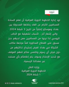 وذكرت الخطوط في بيان تلقته “وطن نيوز”، أن “إدارة الخطوط الجوية العراقية، تود أن تعلم السادة المسافرين الكرام عن الغاء رحلاتها المجدولة بين 2024 3 شباط بغداد وموسكو إعتباراً من تاريخ والى إشعار آخر، لأسباب تشغيلية مع الجانب الروسي “.