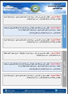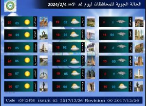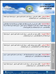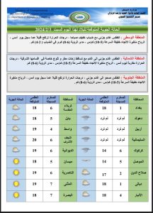 أعلنت هيئة الانواء الجوية والرصد الزلزالي، اليوم السبت ، ، حالة الطقس في البلاد، فيما توقعت طقساً غائماً وارتفاعاً في درجات الحرارة خلال الأيام المقبلة، مع فرصة لتساقط الثلوج في بعض المناطق الشمالية.