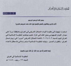 اعلنت المقاومة الاسلامية في العراق، اليوم السبت، استهداف قاعدة حرير في أربيل بالطيران المسير.
