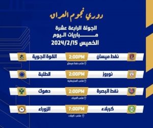 تنطلق اليوم الخميس ، منافسات الجولة 14 من دوري نجوم العراق بإقامة 4 مباريات على ملاعب نفط ميسان والسليمانية والميناء وكربلاء.