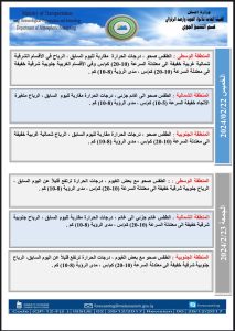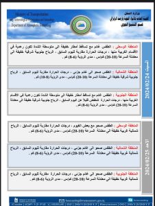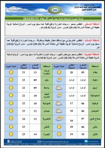 أعلنت هيئة الأنواء الجوية، اليوم الأربعاء، عن حالة الطقس في البلاد للأيام المقبلة، فيما توقعت تساقطاً للأمطار بدءاً من الأسبوع المقبل.
