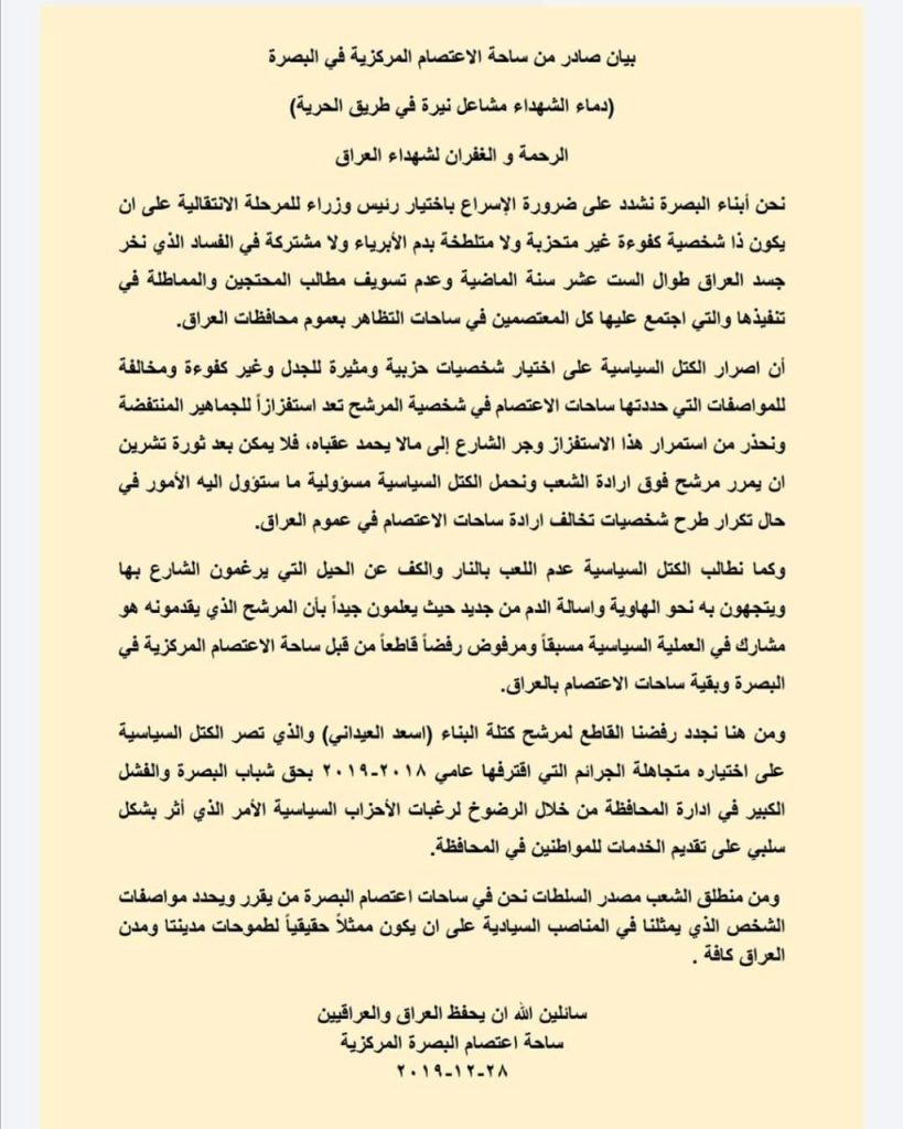 أصدر معتصمي محافظة البصرة اليوم السبت، بيانا يخص اختيار رئيس الوزراء المقبل.