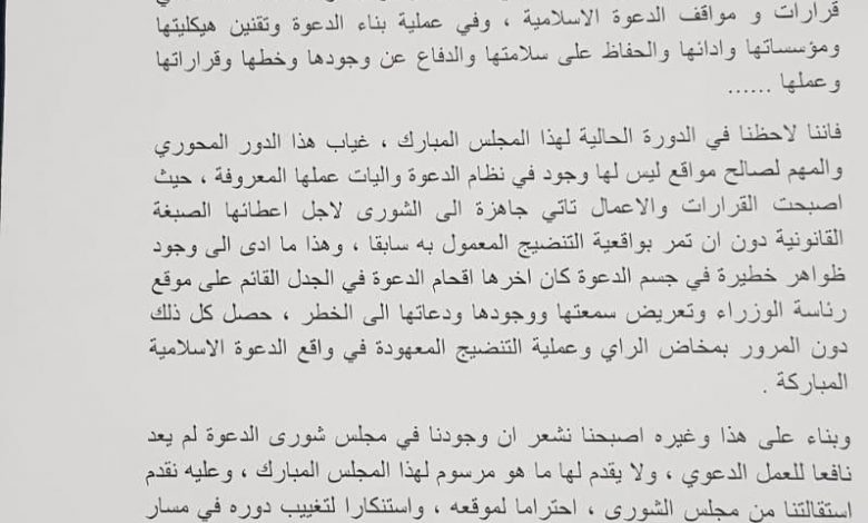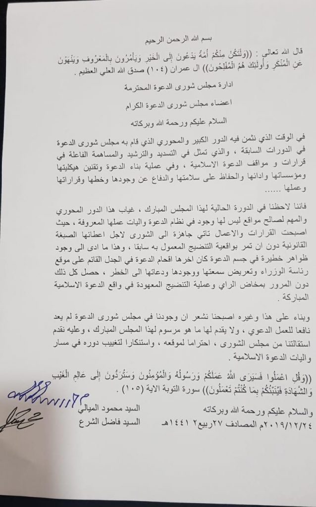 حصلت وكالة أحداث الوطن اليوم الأحد، على وثيقة تبين استقالة عضوان اخران من حزب الدعوة الإسلامي. وادناه صورة للوثيقة :