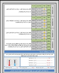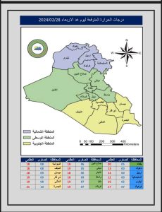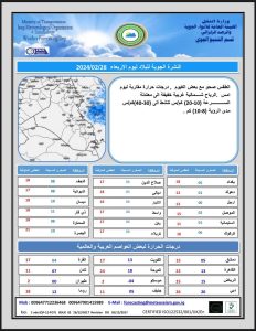 أعلنت هيئة الانواء الجوية، اليوم الاربعاء ، حالة الطقس المتوقعة في البلاد خلال الايام المقبلة، فيما اشارت الى أن الرياح شمالية غربية مع انخفاض بدرجات الحرارة وفرص هطول امطار في المناطق الشمالية من العراق.