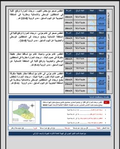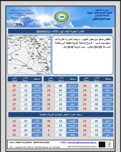 أعلنت هيئة الأنواء الجوية، اليوم الثلاثاء ، عن حالة الطقس في البلاد للأيام الأربعة المقبلة، فيما توقعت ارتفاعاً في درجات الحرارة وفرصاً لتساقط أمطار خفيفة بمناطق متفرقة من البلاد.