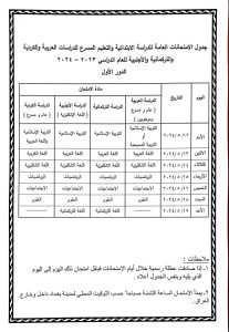 وأشارت الوزارة في بيان تلقته “وطن نيوز”، الى ” جداول الامتحانات الوزارية لمراحل ( السادس الابتدائي ، الثالث المتوسط ، السادس الاعدادي ) للعام الدراسي (2023-2024)”.