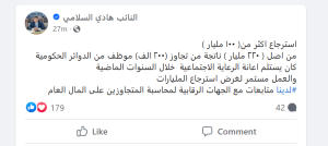 وقال السلامي في تدوينة تابعتها “وطن نيوز”، إنه ” تم استرجاع اكثر من 100 مليار من اصل 220 مليار جراء تجاوز 200 الف موظف في الدوائر الحكومية على شبكة الرعاية الاجتماعية خلال السنوات الماضية”.