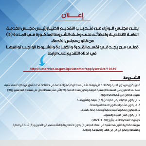 وأشار المجلس الى ان “آخر موعد لتسلم الطلبات بتأريخ (30-4-2024) مع ملاحظة ان القانون قد اشترط في أعضاء المجلس ان يكون اختصاص ثلاثة منهم في القانون وثلاثة في الإدارة والاقتصاد وعضو في كل من الطب والهندسة والزراعة.
