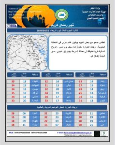 أعلنت هيئة الانواء الجوية، اليوم الاربعاء ، حالة الطقس المتوقعة في البلاد خلال الايام المقبلة، فيما اشارت الى استقرار درجات الحرارة عند الثلاثين مئوية مع فرص لهطول امطار الاحد المقبل.
