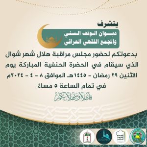 وقال اعلام الوقف في بيان تلقته “وطن نيوز”، ان “ديوان الوقف السني والمجمع الفقهي العراقي يتشرفان بدعوتكم لحضور مجلس مراقبة هلال شهر شوال”.